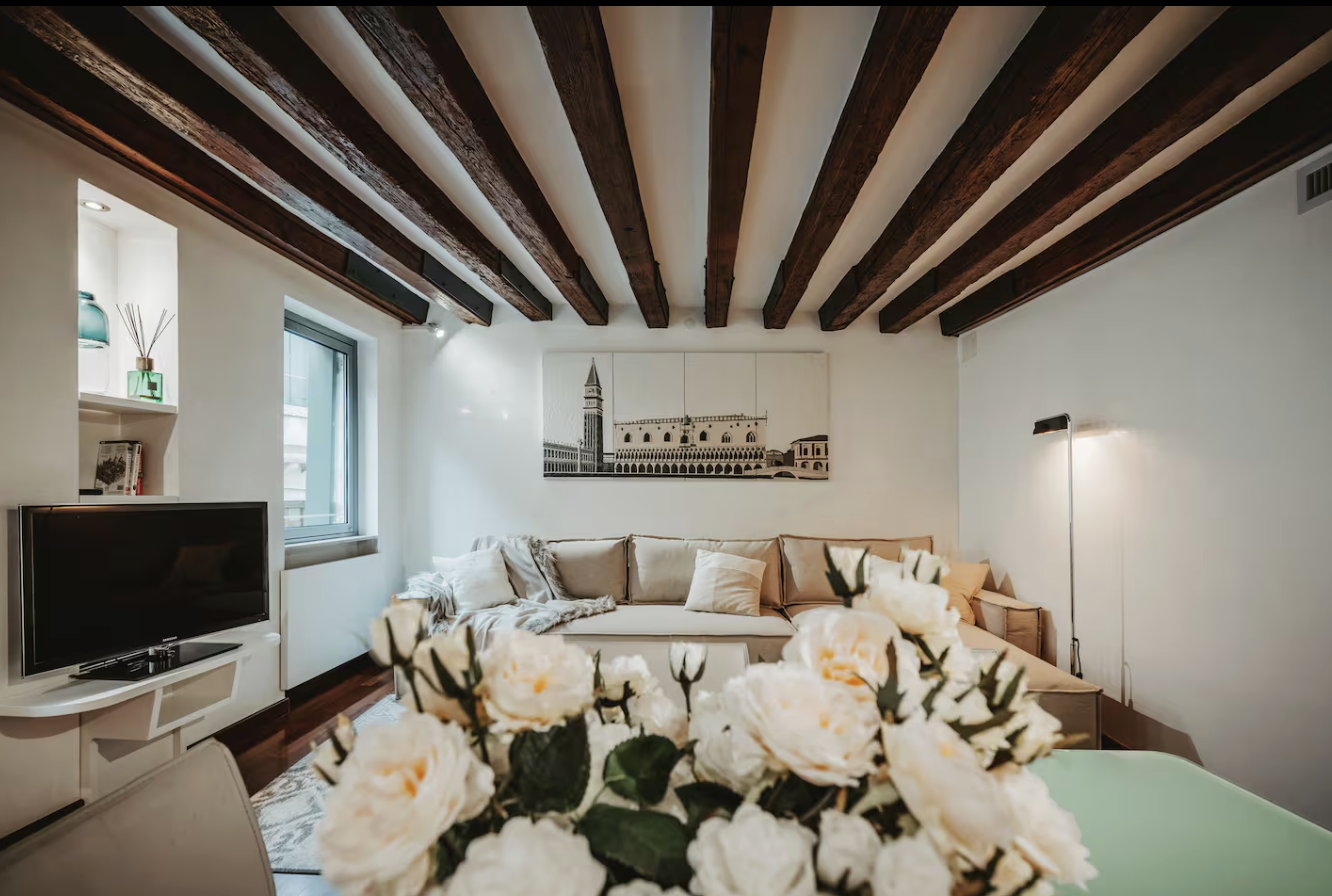 Geräumiger Wohnbereich mit zusätzlichem Schlafsofa und Netflix/YouTube Smart TV. Halboffene Küche mit Mikrowelle, Wasserkocher, Kaffeemaschine, komplettem Küchengeschirr und Willkommensgruß. Doppelschlafzimmer “Rossa“ mit Kingsize-Bett 160x200 cm und geräumigem Kleiderschrank. Schlafzimmer “Azure“ mit französischem Bett 140x200 cm und Schreibtisch. Modernes Badezimmer mit geräumiger Dusche, edlen Oberflächen, Waschmaschine, hochwertigem Pflegeset (Seife, Duschgel). Ultraschnelles Glasfaser-Wi-Fi, unabhängige Klimaanlage, perfekte Klimatisierung zu jeder Jahreszeit. In der Nähe von Ponte Sospiri, Teatro La Fenice, Rialto. Ideal für Paare oder Familien.