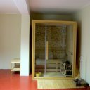 Das Untergeschoss ist in mehrere Bereiche unterteilt: Taverne für Feste und Abendessen, Wellnessbereich, Spielbereich und Servicebereich. Die Taverne besteht aus einem großen Wohnzimmer mit zwei großen Holztischen und Bänken, an denen bis zu 30 Personen Platz finden, einer traditionell eingerichteten Küche und einem charakteristischen Holzofen. Der Wellnessbereich ist ein geräumiger und sorgfältig gestalteter Ort, an dem Sie sich bei Musik und sanfter Beleuchtung in der Sauna oder bei einer Massage entspannen können. Der Spielbereich ist ein kleiner Raum mit weichen Teppichen für Kinder, Spielen für die Kleinsten und auch für Erwachsene mit Tischfußball und Darts. Die Wirtschaftsräume bestehen aus einer großen Waschküche, die mit mehreren Waschmaschinen und Trocknern ausgestattet ist, einem Badezimmer, einer großen Speisekammer und dem Pflanzenraum.