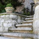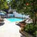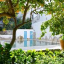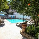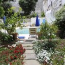 Garten mit privatem Pool, technische Räume, und Blick auf den Yachthafen und mittelalterlichen Dorf.