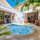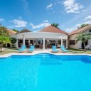 Ein überdachter Pavillon beherbergt einen Barbereich und einen Grillplatz, perfekt für die Unterhaltung von Gästen. Betreten Sie Ihre eigene private Oase, in der Sie ein glitzernder Swimmingpool erwartet, umgeben von einem üppigen tropischen Garten und einem großen privaten Rasen. LaVilla ist nicht nur ein Haus, sondern ein Zeugnis für einen Lebensstil voller Luxus und Ruhe.