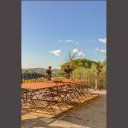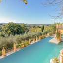 Rund um die Hauptvilla wurde ein typisch italienischer Garten angelegt, mit gepflegten Hecken, Stauden und Säulen, die den Blick auf das traumhafte Panorama der Toskana freigeben.