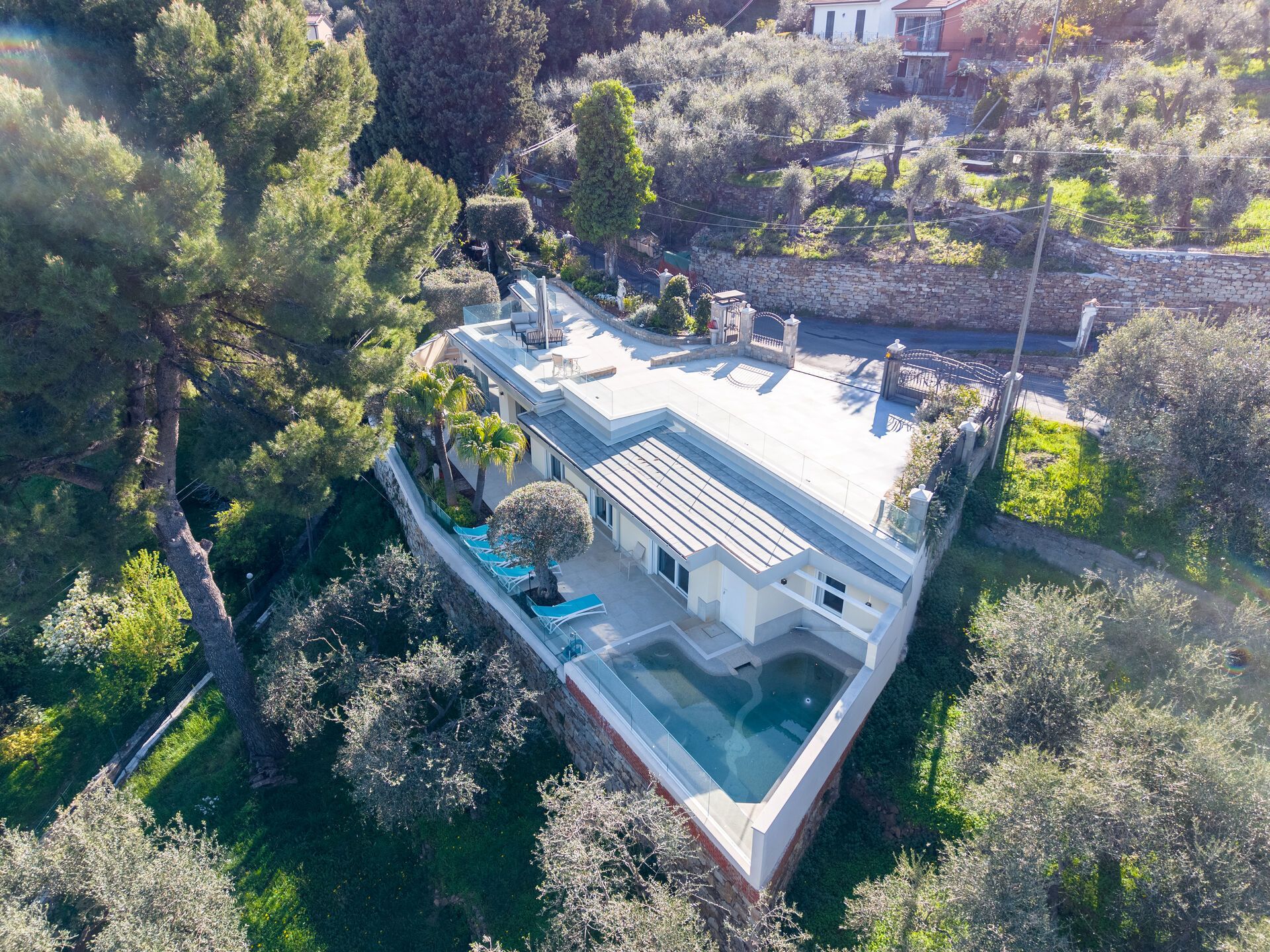 Der Außenbereich, den ich persönlich am meisten liebe: ein angenehmer Außenbereich mit einem Essbereich, Sonnenliegen, jahrhundertealten Olivenbäumen und einem Salzwasser-Harzpool. Es ist der perfekte Ort, um sich zu entspannen, das milde Klima der Riviera zu genießen und sich von der freien Aussicht verzaubern zu lassen.
