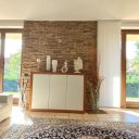 Kellertaverne mit einer Deckenhöhe von 3,80 m: gemütlicher Wohnbereich mit Edilkamin-Pelletofen, Küche, Essbereich, Waschküche, technische Räume, Bad.