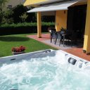 Außenvilla: ein gepflegter Garten, in dem man sich entspannen kann, mit Whirlpool, Außendusche, 20 Quadratmeter großer überdachter Veranda.