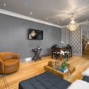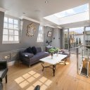 Wunderschön gestaltete Eigentumswohnung mit drei Schlafzimmern, modernem Interieur und hochwertiger Ausstattung sowie einer großen, nach Westen ausgerichteten Dachterrasse, die von einem der drei Empfangsräume aus zugänglich ist und über ausfahrbare Dachfenster verfügt. Die kanalisierte Stuckfassade hat eine Süd- und Westausrichtung. Doppelt verglaste Sprossenfenster sorgen für natürliches Licht allen Räumen.