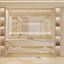 Raffinierte Innenausstattung: Küche mit allem Drum und Dran (italienische Pedini-Küchen, Miele-Geräte), Travertin-Oberflächen, elegante Spiegel und hochwertige Sanitärobjekte