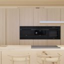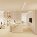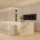Raffinierte Innenausstattung: Küche mit allem Drum und Dran (italienische Pedini-Küchen, Miele-Geräte), Travertin-Oberflächen, elegante Spiegel und hochwertige Sanitäreinrichtungen