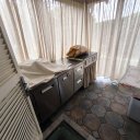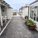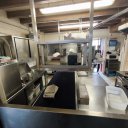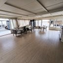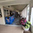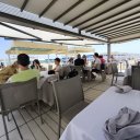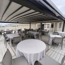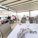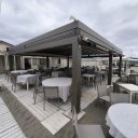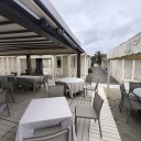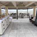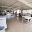 Access is facilitated by a large parking lot along the main road, capable of accommodating up to thirty vehicles. The building, located between the beach and the parking lot, has three floors. On the ground floor, there is management, an elegant bar, a professional kitchen with cold storage, and a staff bathroom. The kitchen is capable of preparing meals for 130 people, served on the large indoor veranda or under the gazebos on the beach.