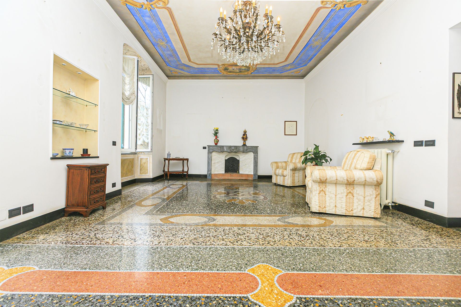 The double reception room is the heart of the home: ceilings soaring to 3.60 metres, adorned with original frescoes, medallions and decorative plasterwork, traditional Genoese terrazzo floors with geometric inlays, and a marble fireplace. These are interiors of genuine rarity — spaces that speak of Genoa's golden age and the cultured lives once lived within them.