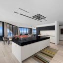 The living spaces express a sophisticated vision of contemporary design, with iconic furnishings such as the Bubble armchair by Roche Bobois and custom-made pieces by Artefacto, resting on wool and silk rugs. The kitchen, conceived as a dramatic and functional environment, is complemented by top-notch appliances Gaggenau and Sub-Zero, as well as refined Roche Bobois designer tables.