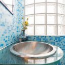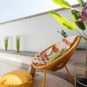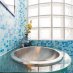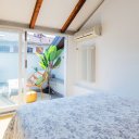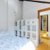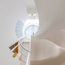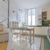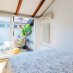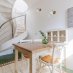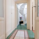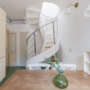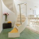 An elegant brick spiral staircase, lit by large skylight, leads to the second level with two rooms, characteristic well terrace, bathroom with blue glass mosaic tiling. Colored resin floors on the second floor.