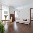On the first level a large living room with balcony, a bedroom/study with two retractable doors made of wood and glass, a cozy eat-in kitchen, a bathroom. Natural parquet floor coverings in the living area.