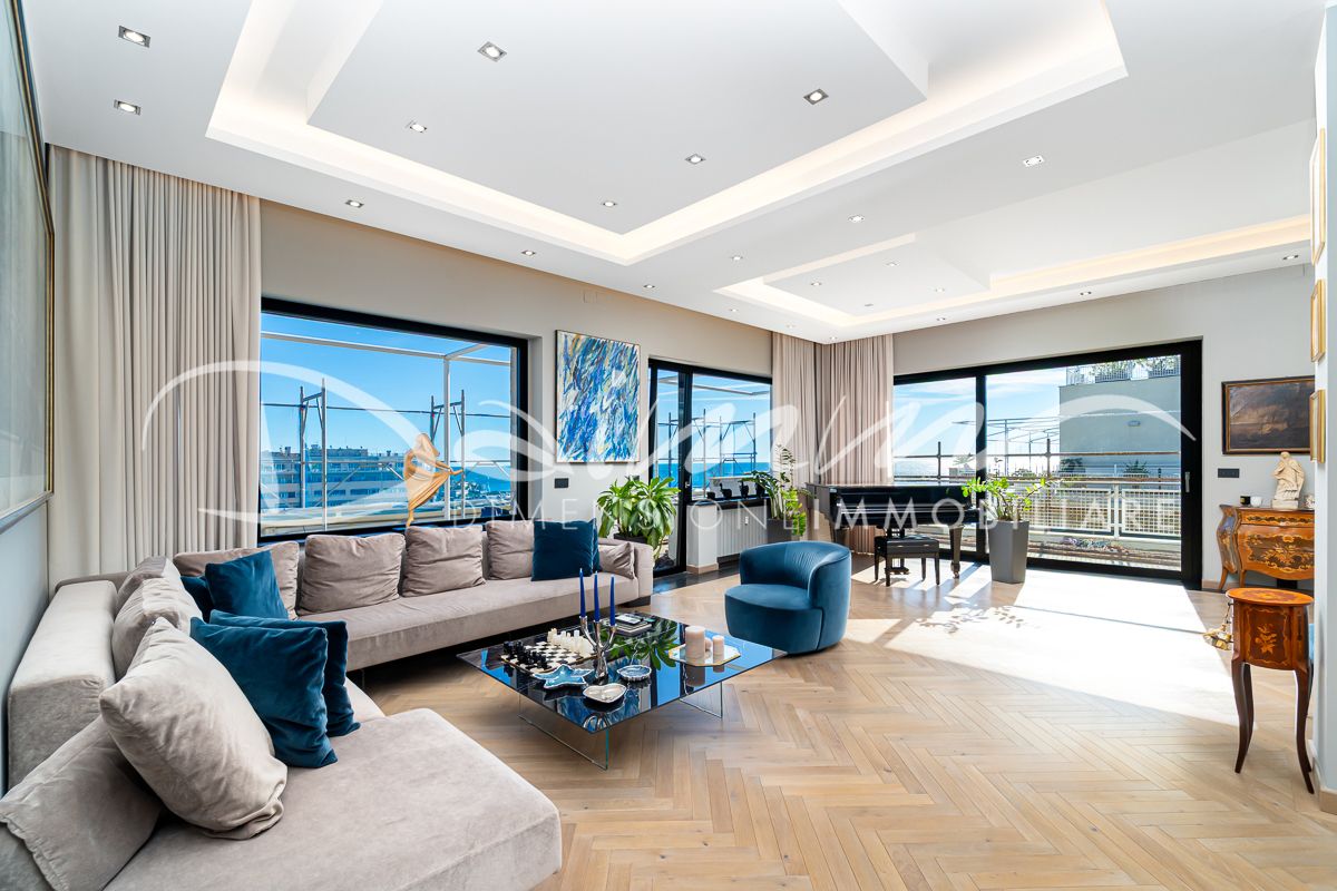 The apartment, finely renovated with materials of the highest quality, stands out for its refinement and brightness. The interiors, with attention to the smallest details, are divided into a large double living room, a panoramic dining room, a custom-made kitchen with marble countertop, three bedrooms,two elegant bathrooms, and a laundry area.