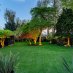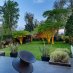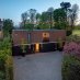 A large built-in gas-controlled fire pit coffee table and outdoor lighting surround the entire outskirts and in front of the trees in the 160 foot garden area.