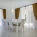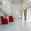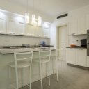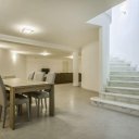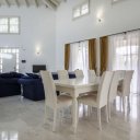Entering the villa, we find a bright and elegant marble staircase and a cozy large living and dining area with the excellently equipped kitchen right next to the dining area.
