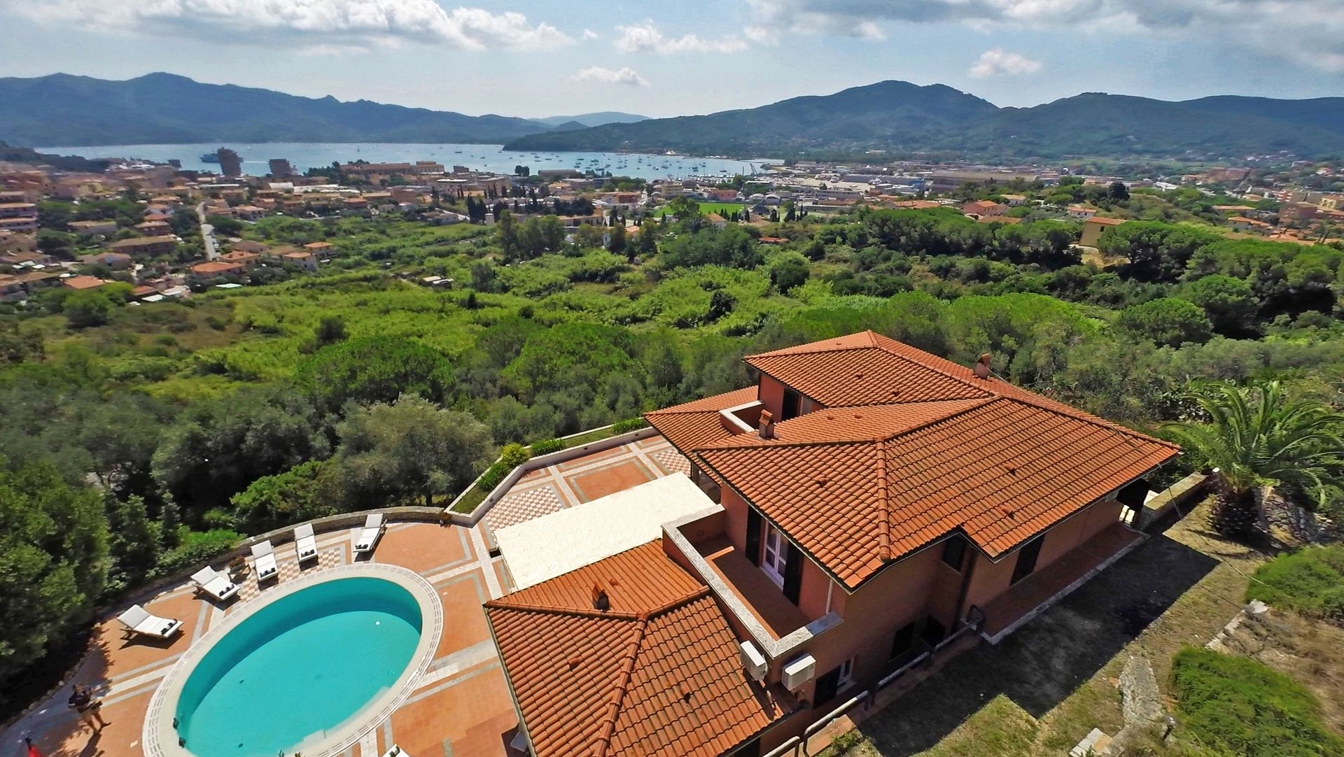 The property is located in the municipality of Portoferraio (LI) in the village of Consumella, and consists of a detached villa of about 450 square meters in total with garden, land, swimming pool and garages. Recently it has been subject to the expansion of the available parking spaces and the creation of an area that can be used as a private heliport. Lastly, we emphasize the proximity to the nerve center of the Island of Elba . The properties are located in the hilly area in the vicinity of the town of Portoferraio in a panoramic position on the homonymous gulf. You reach the real estate units along about 200 meters of paved private road connecting with the main road system. The building is built with reinforced concrete load-bearing structure and consists of two floors above ground and basement floor . The roof is pitched sloping brick with tile covering . The facades are masonry plastered and painted . The area of relevance nearest building is spread over two levels separated by a stone retaining wall at the ground floor, this area is paved and houses a circular swimming pool with a capacity of about 80/85 thousand liters, masonry planters, barbecue area and wood stove. On the second level, at the second floor, there is an unpaved area used as a garden in which space for the heliport has recently been obtained . The remaining parts of the pertine area left green with wild essences olive and pine trees. The private access road leads first to the parking spaces (5/6) and then to the basement where there is a large porch, also usable as covered parking, and the two garages . Outside the perimeter of the villa there are 2 more parking spaces on the property. The basement level consists of an entrance, a cellar room equipped with windows on gutter , two garages, bathroom and technical room . On the upper level are an entrance hall , hallway , laundry room , staircase to the upper level , kitchen , pantry room , a large living room and a bedroom . They are instead accessible from the outside, near the pool, a bathroom and a storage room dedicated to the pool . The second floor consists of a large hallway and three double bedrooms all with a bathroom for exclusive use . Three well terraces usable . The property has an independent LPG heating system with large-capacity tank buried in the area of relevance and high-efficiency radiant elements . In each habitable room there is also an indoor unit of air conditioning system (split) with the function also of heat pump. The property is equipped with tanks for the accumulation of water reserves divided into 6 tanks that are used for collection (including rain) for a total of about 50,000 liters. The garden is equipped with an automatic irrigation system. The villa is equipped with an advanced burglar alarm system with remote video surveillance, Wi-Fi system on private radio link and centralized digital/satellite TV system.