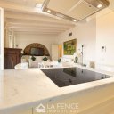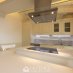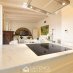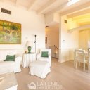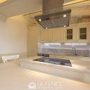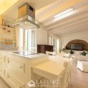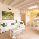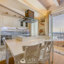The living area, on the third floor, provides an open space living area with open kitchen with peninsula in white Carrara marble,