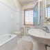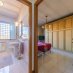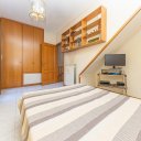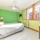 On the second floor is the sleeping area, consisting of two double bedrooms and a windowed bathroom with tub. The master bedroom enjoys a balcony overlooking the garden, while the second double bedroom has an additional balcony with an interior view.