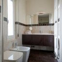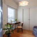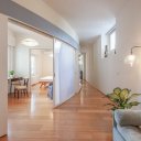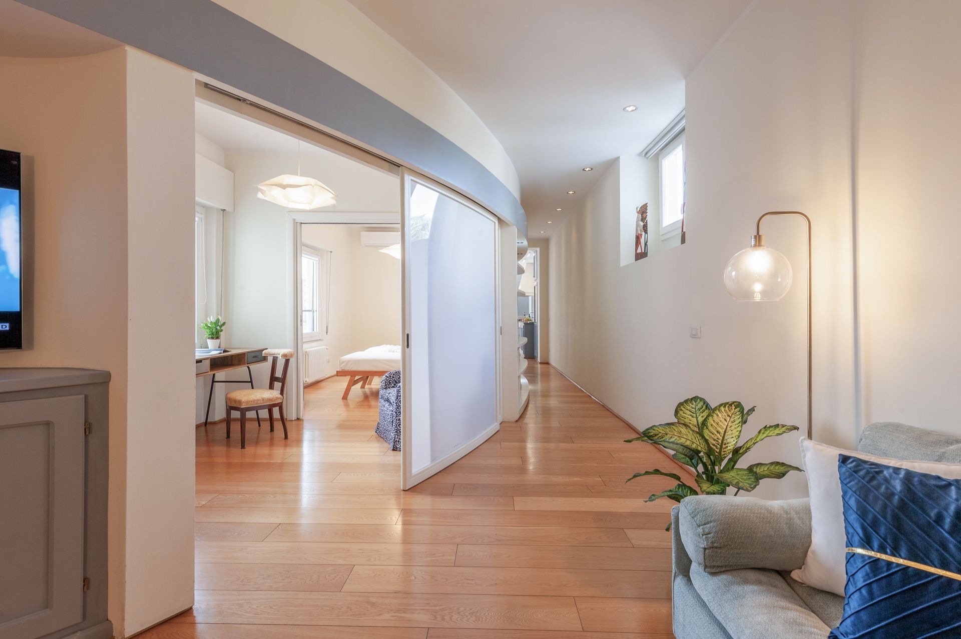 Los espacios se abren y cierran con gracia: puertas curvas que se deslizan con ligereza, el dormitorio que aparece y desaparece, un rincón de estudio frente a la ventana donde los pensamientos encuentran un respiro mientras se contemplan los tejados de Florencia.