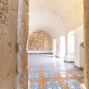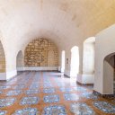 El pavimento de los exteriores es de piedra, mientras que el de los interiores es de terracota decorada o cerámica.