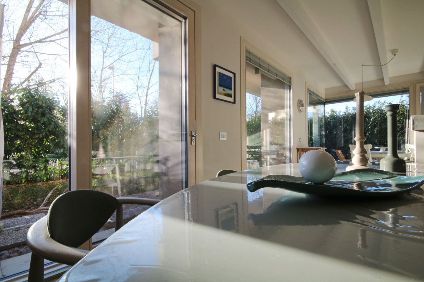 Planta baja: la entrada conduce a una amplia y luminosa zona de estar, elegantemente dividida en zona de relax, comedor y amplia cocina. Un funcional pasillo conduce al estudio, ideal también como dormitorio doble, al cuarto de baño y al lavadero. Toda la planta dialoga armoniosamente con el exterior gracias a los grandes ventanales correderos que se abren al espléndido jardín privado, creando una continuidad natural entre interior y exterior. Una cómoda escalera interior conduce a la planta superior, dedicada a la zona de noche. (La planta está apilada como habitación accesoria y tiene una altura de ml. 2,60)