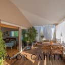 Los espacios interiores se desarrollan en tres niveles, donde cada planta cuenta una experiencia de vida única. En el nivel principal, la luz natural se filtra a través de grandes ventanales y envuelve el salón, creando un ambiente cálido y armonioso. La veranda exterior, enmarcada por cortinas blancas, se convierte en el lugar perfecto para momentos tranquilos o para disfrutar de la puesta de sol sobre el jardín de flores.