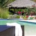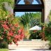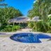 En el exterior, la lujosa villa está rodeada de exuberantes jardines y numerosas palmeras exóticas. La piscina, de buen tamaño, tiene una entrada a nivel cero en un lado y un extremo muy profundo con jacuzzi y cascada independientes en el otro. Las terrazas de la piscina, de piedra de coral, son frescas al tacto y ofrecen una agradable sensación de calor en los pies. Un cenador con techo de paja ofrece vistas al océano y una exposición constante a los siempre presentes vientos alisios. Detrás del cenador, una puerta se abre a un camino que conduce directamente a las hermosas playas.