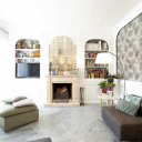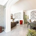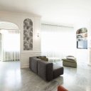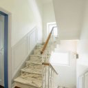 - Escalera interior acabada en mármol blanco Calacatta verde, suelo del salón en mármol Candoglia gris.