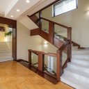 Una gran escalera de madera y mármol conduce al nivel superior, donde se encuentra la suite principal, equipada con vestidor, baño con bañera de hidromasaje y ducha, y una terraza con vistas al mar. El nivel inferior alberga otra zona de cocina-salón con acceso directo a la piscina, dos dormitorios con baño en suite, ideal para invitados, y una alegre habitación utilizada actualmente como vestidor y lavadero.