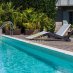 -Piscina enmarcada por vegetación y caminos de piedra