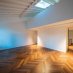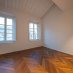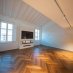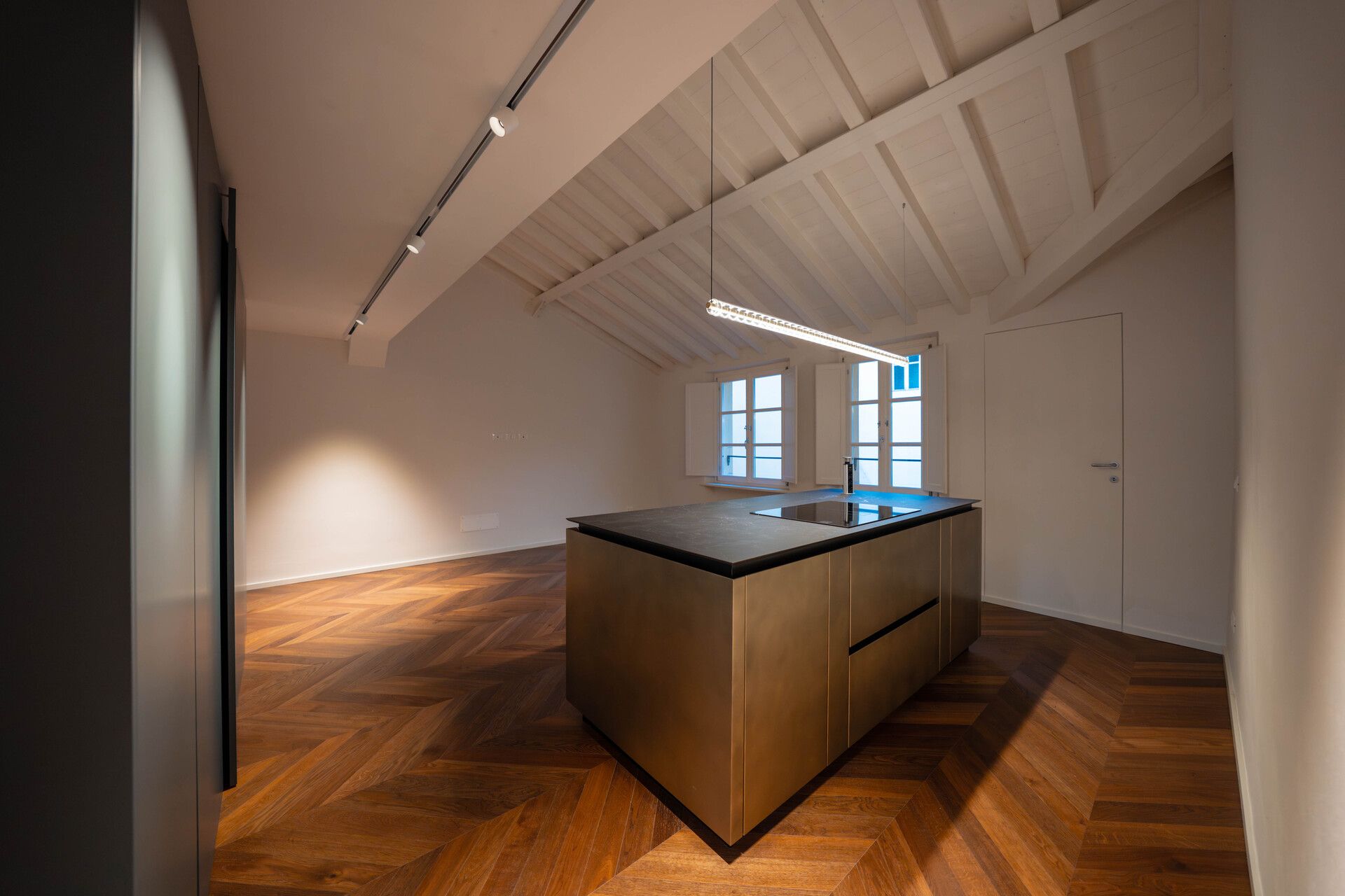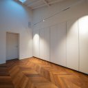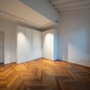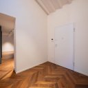Les pièces, spacieuses et lumineuses, sont embellies par des parquets en bois couleur noyer, posés en chevrons, qui accompagnent le regard et donnent une continuité et une chaleur aux espaces. Les surfaces murales claires et les plafonds avec des poutres en bois peintes en blanc créent une atmosphère aérée et sophistiquée, renforcée par la lumière naturelle qui enveloppe chaque pièce.