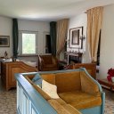 Premier étage : autre entrée indépendante, grand salon avec cheminée et terrasses panoramiques, cuisine habitable, deux chambres doubles et deux salles de bain avec fenêtre.