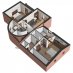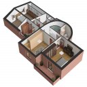 La villa est disposée sur trois niveaux reliés par un escalier intérieur : le sous-sol avec le garage et divers débarras, le rez-de-chaussée avec la zone de vie et le premier étage avec la zone de couchage.
