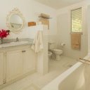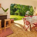 Interior espaçoso e luminoso: O coração da casa é a sala de estar espaçosa e luminosa, concebida para maximizar a ligação com o exterior. Grandes portas abrem-se para um exuberante jardim tropical, criando uma extensão natural do espaço de estar e permitindo que a brisa do mar circule livremente. É o local ideal para relaxar, receber convidados ou simplesmente desfrutar da serenidade da paisagem das Caraíbas.
