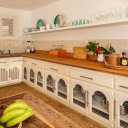 A cozinha, embora luminosa e moderna, mantém um encanto rústico que lhe confere calor e carácter. Equipada com electrodomésticos topo de gama e amplas bancadas de trabalho, é um paraíso para os amantes da cozinha. Também aqui, as portas abrem-se diretamente para o jardim, facilitando o acesso à área de refeições exterior e ao barbecue.