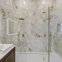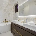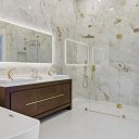A suite principal, espaçosa e luminosa, tem acesso direto ao exterior, um closet feito à medida e uma casa de banho privativa de inspiração spa com duche em vidro e acabamentos requintados.
